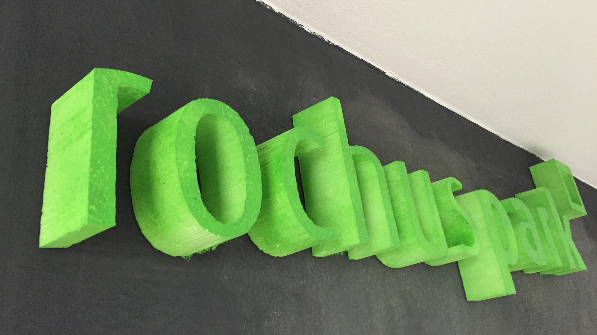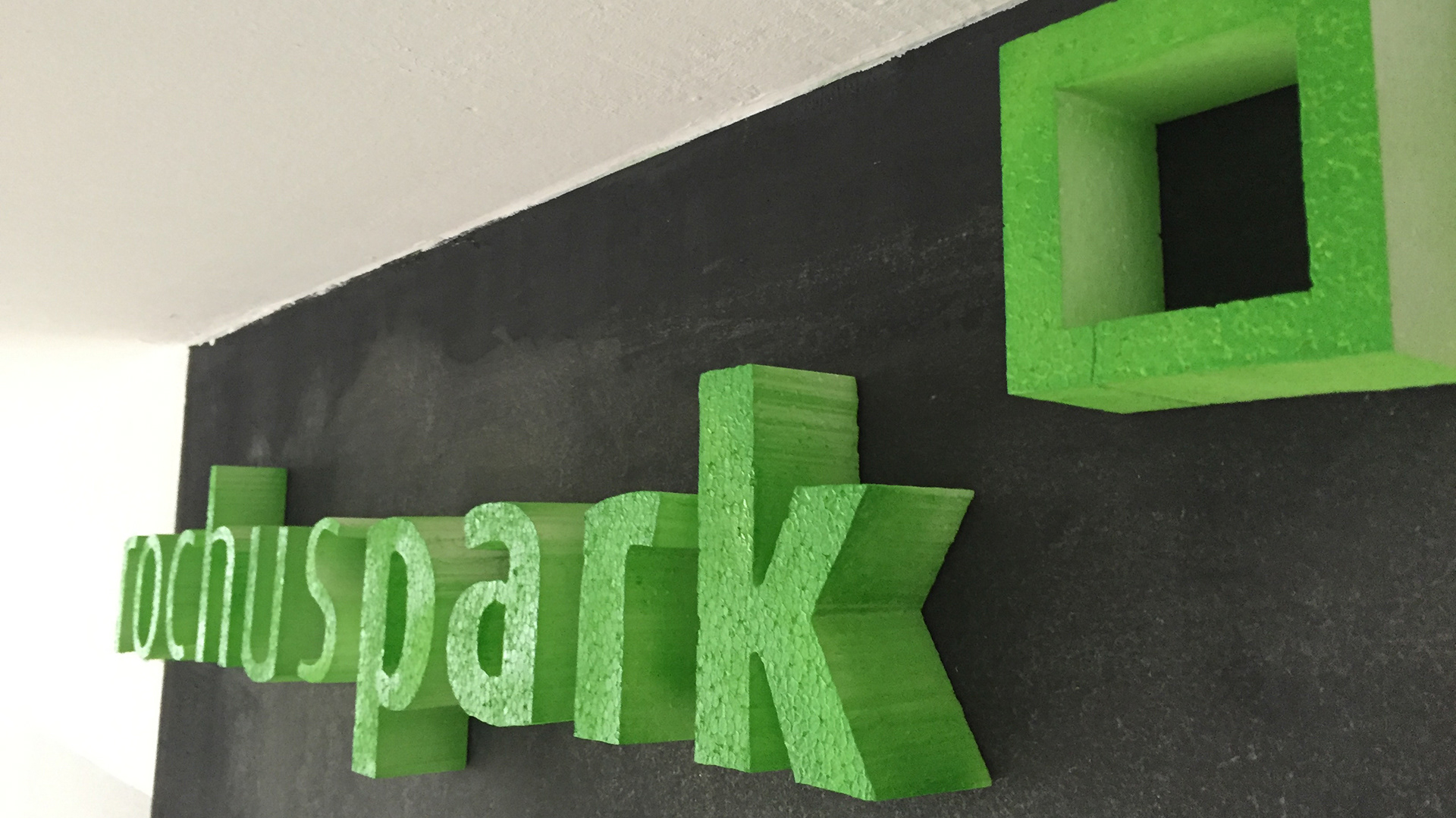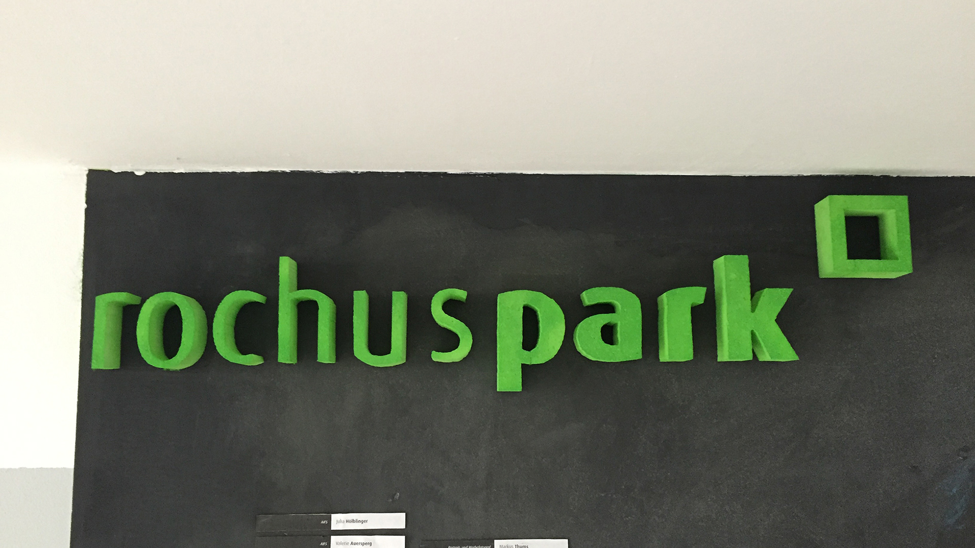 Das Logo vom Rochuspark (Coworkingspace) in 3-D umgesetzt für den Eingangsbereich.